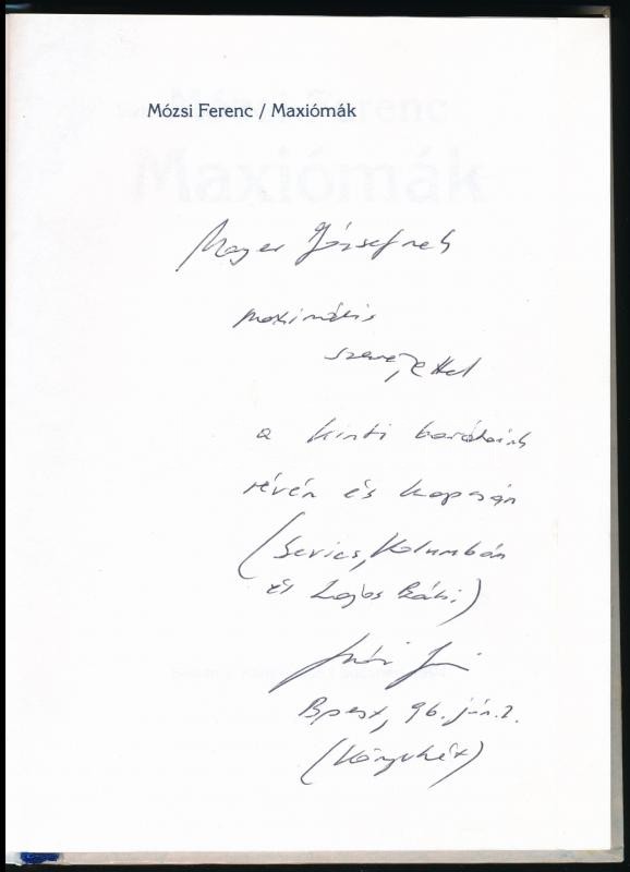 Leírás: Mózsi Ferenc: Maxiómák. Morvay László illusztrációival. Bp.,1994, Belvárosi. Kiadói kartonált papírkötés. A szerző által dedikált.
