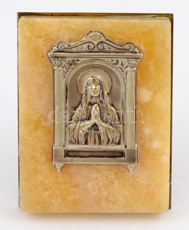 Leírás: Szűz Máriát ábrázoló kis asztali szentkép, fém-alabástrom, 8×6 cm