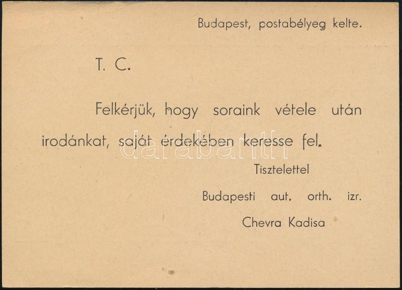 1944 A Budapesti Chevra Kadisa (Dob utca 12.) megíratlan levelezőlapja... https://www.darabanth.com/hu/357-Gyorsarveres/357.0/Mutargy-papirregiseg-egyeb/Judaika~500035/1944-A-Budapesti-Chevra-Kadisa-Dob-utca-12-megiratlan-levelezolapja-melyben-keri-a-cimzettet~II2049768