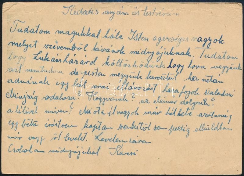 Leírás: 1944 Munkaszolgálatos hazaküldött levele Pesthidegkútra