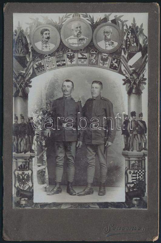 Leírás: cca 1900-1914 Katonák műtermi emlékfotója, rajta Ferenc József, Ferenc Ferdinánd arcképével, kartonra kasírozott fotó, Unica Trieszt, 16×10,5 cm