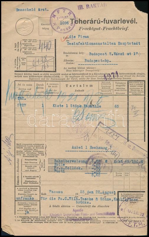 Leírás: 1925 MFTR teheráru fuvarlevél, a belső oldalon a Tihany, a Cserhalom és a Tas gőzösök fedélzeti bélyegzőivel