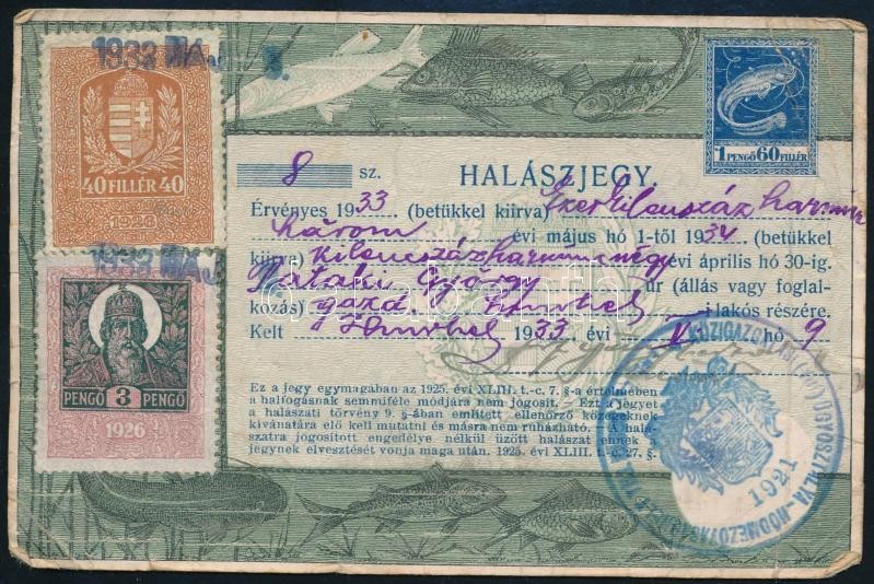 Leírás: 1933 Hódmezővásárhely, halászjegy, pecséttel, benyomott 1,60 P, és 40 fillér, 3 P okmánybélyegekkel.