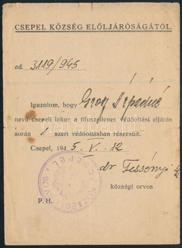 1945 Csepel, Csepel Község Elöljárósága által kiállított igazolás tífu... https://www.darabanth.com/hu/357-Gyorsarveres/357.0/Mutargy-papirregiseg-egyeb/Okmanyok~500017/1945-Csepel-Csepel-Kozseg-Eloljarosaga-altal-kiallitott-igazolas-tifusz-ellen-vedooltC3~II2052717