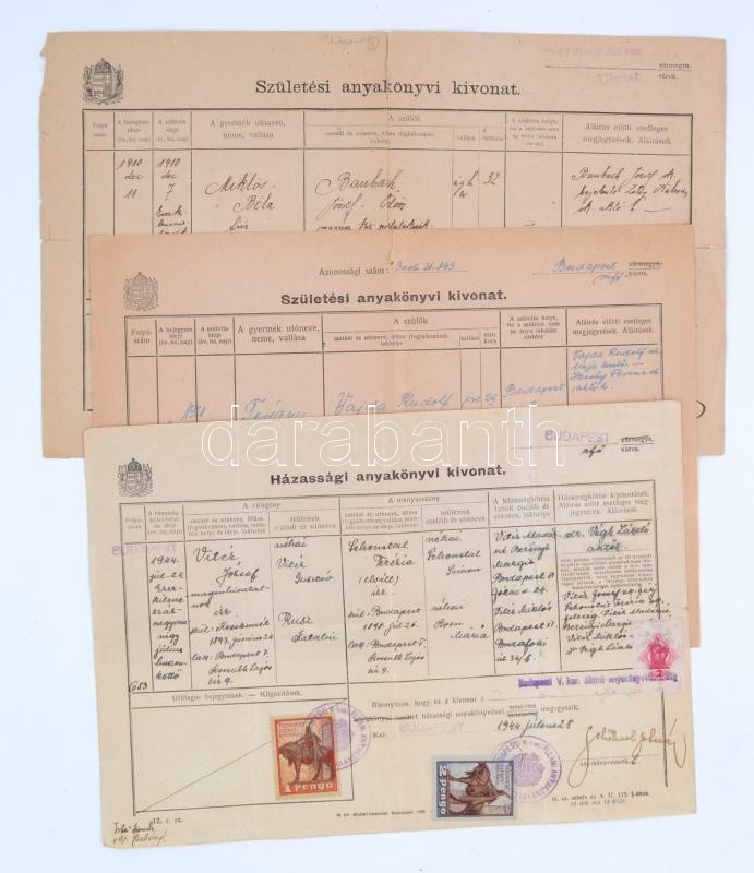 cca 1921 3 db anyakönyvi kivonat: 2 db születési, 1 db házassági, ille... https://www.darabanth.com/hu/357-Gyorsarveres/357.0/Mutargy-papirregiseg-egyeb/Okmanyok~500017/cca-1921-3-db-anyakonyvi-kivonat-2-db-szuletesi-1-db-hazassagi-illetekbelyegekkel~II2047234