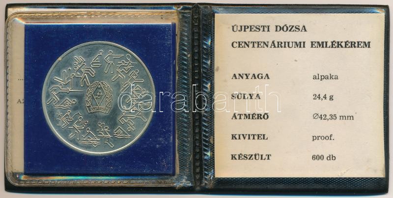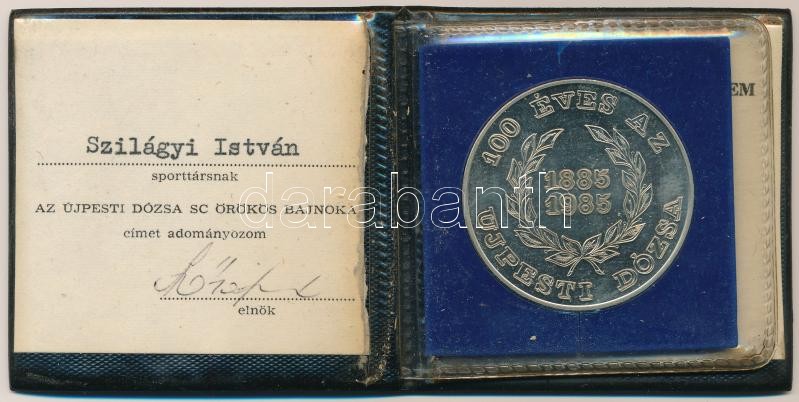 Leírás: 1985. "100 éves az Újpesti Dózsa 1885-1985" alpakka emlékérem eredeti tokban, tanúsítvánnyal, a sportklub akkori elnökének aláírásával (42,35mm) T:1-