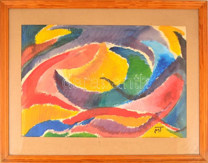 Leírás: MT jelzéssel: Kompozíció. Akvarell, papír, üvegezett keretben, 40×59 cm