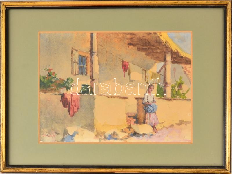 Leírás: Neogrády Antal (1861-1942): Lány a ház előtt. Akvarell, papír, jelzett, üvegezett keretben, 20×27 cm