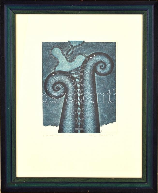 Leírás: Olvashatatlan jelzéssel: Liaison. Színes rézkarc, papír, üvegezett keretben, 24×18 cm