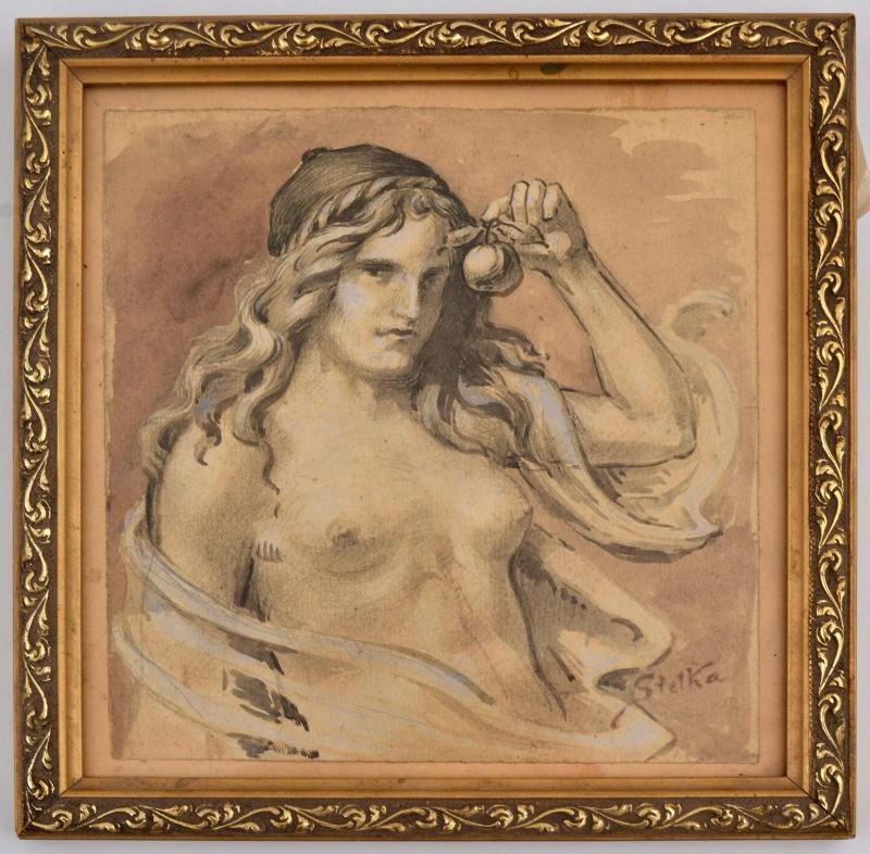 Leírás: Stetka jelzéssel: Női félakt. Vegyes technika, papír, üvegezett keretben, 22×21 cm