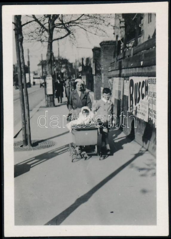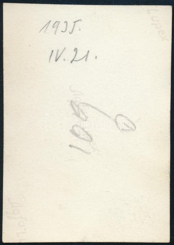 1935. április 21. Kinszki Imre (1901-1945) budapesti fotóművész hagyatékából, a szerző által feliratozott vintage fotó (Kinszki Imre családjának vasárnapi sétája Zuglóban), 6x4,5 cm