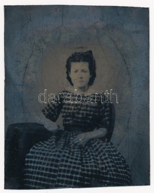 cca 1910 Ferrotípia (vaslemezre készült, vásári gyorsfénykép, amit a fénysugarak beesési és visszaverési szögétől függően negatívként és pozitív képként egyaránt láthatunk), 6,4x5 cm