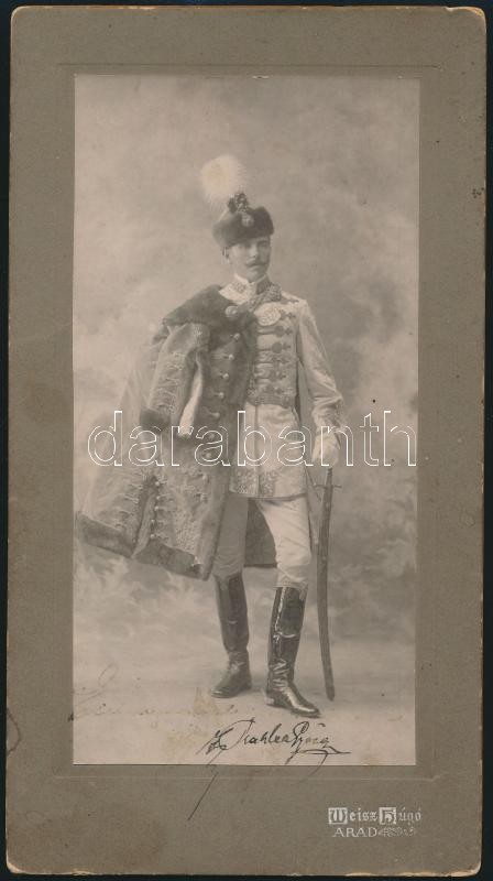 Leírás: cca 1910 Kahler György (?-?) díszmagyarban, feliratozott fotó Weisz Hugó aradi műterméből, 24×13 cm