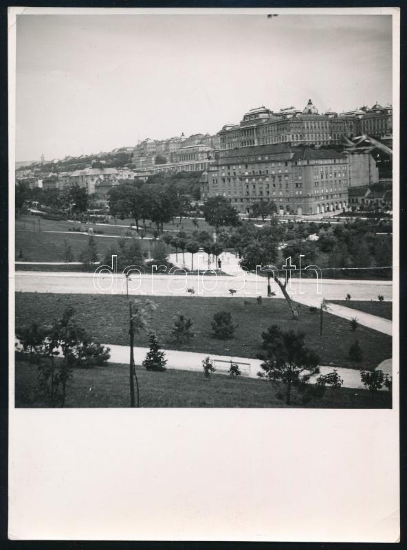 Leírás: cca 1935 Budapest, a Tabán lebontása utáni rendezett terület a Királyi Várral, fotó, középen törésvonallal, hátoldalon megerősítve, 17×12,5 cm