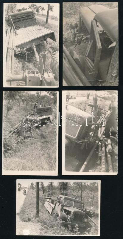 Leírás: cca 1960-1970 Árokba borult Csepel-teherautó, 5 db fotó, 6x9 cm
