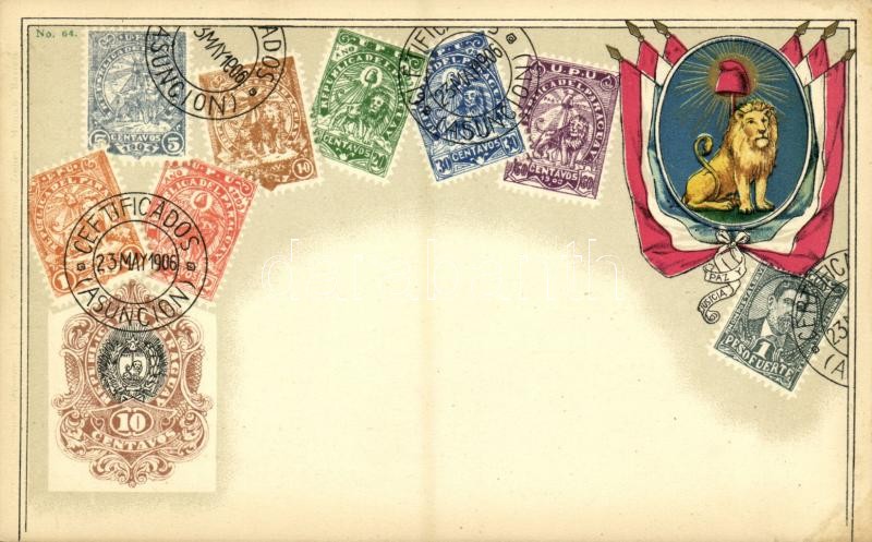 Leírás: Republica del Paraguay / Stamps, flag and coat of arms of Paraguay. Carte Philatelique Ottmar Zieher No. 64. litho