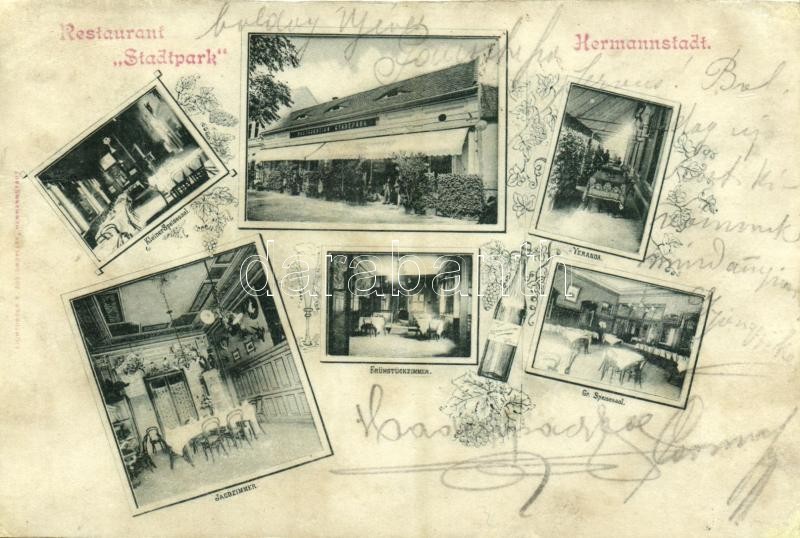 1900 Nagyszeben, Hermannstadt, Sibiu; Restauration "Stadtpark", Kleiner Speisesaal, Veranda, Frühstückzimmer, Gr. Speisesaal, Jagdzimmer / Stadtpark vendéglő, étterem, kis és nagy étkező belső, veranda, reggeliző szoba, vadászszoba. Lichtdruck v. Jos. Drotleff / restaurant, interiors, dining halls, breakfast room, hunting lounge, porch. Art Nouveau, floral (r)