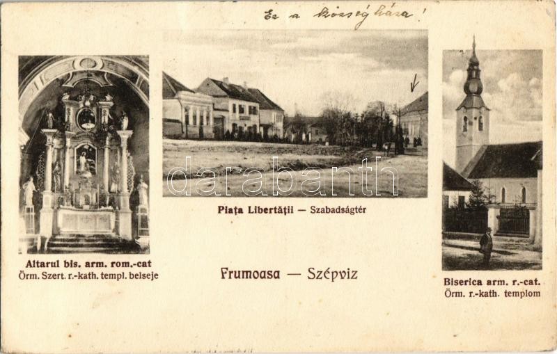 1928 Csíkszépvíz, Szépvíz, Frumoasa; Szabadság tér, Örmény római katolikus templom és belső / Biserica arm. r.-cat., Piata Libertatii / square, Armenian Roman Catholic church interior