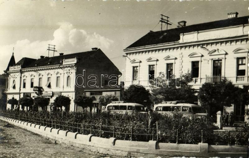 Leírás: 1942 Szilágysomlyó, Simleu Silvaniei; utca, Kiss László üzlete, autóbusz / street view, shops, autobus. photo