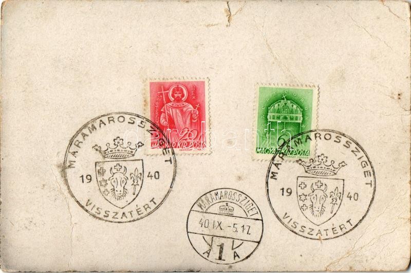 Leírás: Máramarossziget, Sighetu Marmatiei; Fő tér, Gyógyszertár, üzletek / main square, pharmacy, shops (non PC) + 1940 Máramarossziget visszatért So. Stpl. (szakadás / tear)
