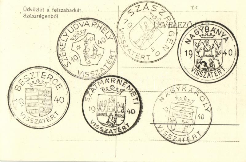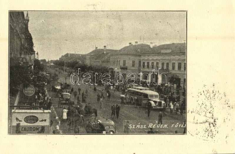 Szászrégen, Reghin; Üdvözlet a felszabadult Szászrégenből! Fő tér, autóbusz, automobilok, tömeg, üzletek / main square, autobus, automobiles, crowd, shops + "1940 Szászrégen, Beszterce, Székelyudvarhely, Nagybánya, Nagykároly, Szatmárnémeti visszatért" So. Stpl.