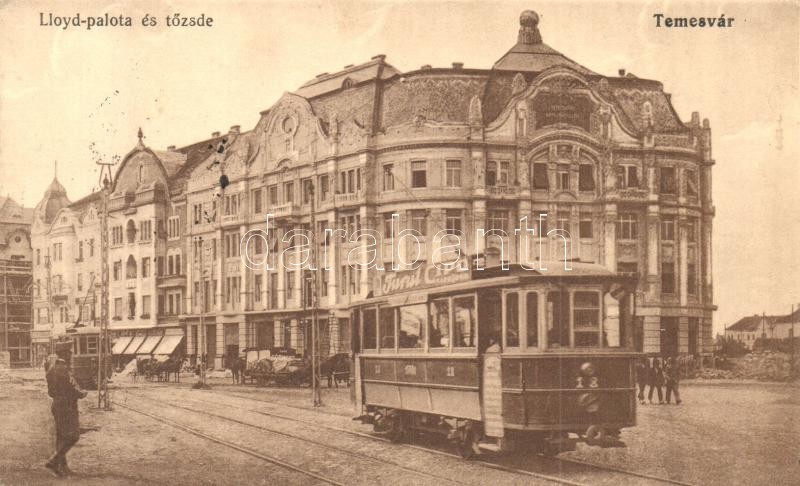 Temesvár, Timisoara; Lloyd palota és tőzsde, 18-as villamos Turul cipő... https://www.darabanth.com/hu/358-Gyorsarveres/358.0/Kepeslapok/Erdely~1000005/Temesvar-Timisoara-Lloyd-palota-es-tozsde-18-as-villamos-Turul-cipo-reklammal-Moravetz-Test~II1588765