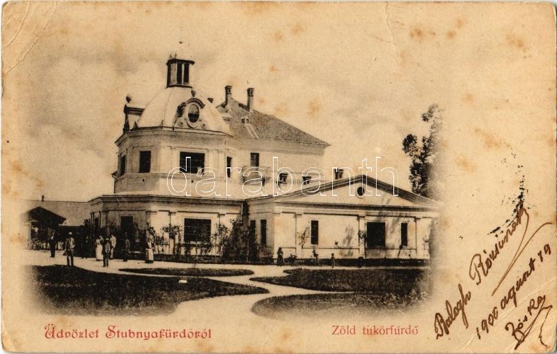 Leírás: 1900 Stubnyafürdő, Túróchévíz, Stubnianske Teplice, Turcianske Teplice; Zöld tükörfürdő / spa, bathing house (EB)