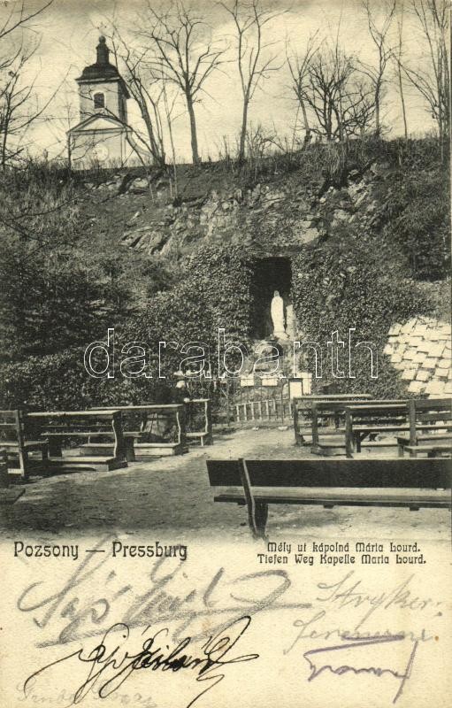 1903 Pozsony, Pressburg, Bratislava; Mély úti kápolna Mária Lourd. &qu... https://www.darabanth.com/hu/358-Gyorsarveres/358.0/Kepeslapok/Felvidek~1000006/1903-Pozsony-Pressburg-Bratislava-Mely-uti-kapolna-Maria-Lourd-Bediene-dich-allein-Tiefe~II2058260
