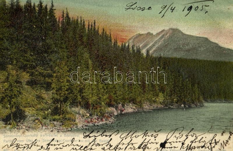 Leírás: 1905 Tátra, Vysoké Tatry; Szentiványi-Csoprbai tó és Bástya. Feitzinger Ede 1902/12. 467. / Strbské pleso, Basta / lake, mountain