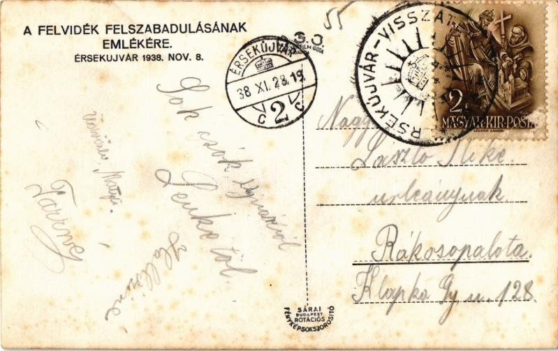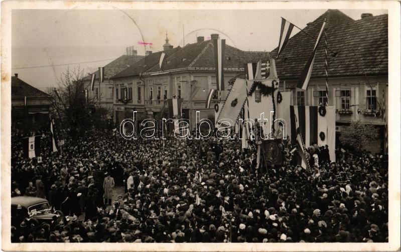 Leírás: 1938 Érsekújvár, Nové Zámky; bevonulás, ünneplő tömeg / entry of the Hungarian troops, cheering crowd + 1938 Érsekújvár visszatért So. Stpl.