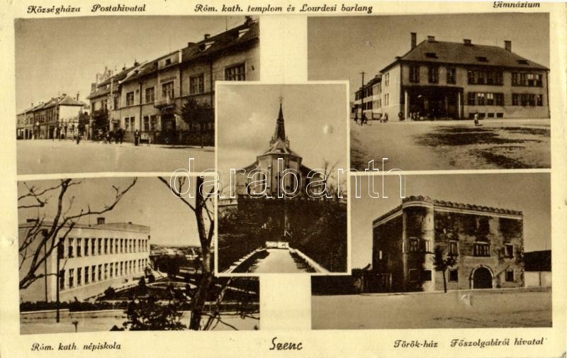 1942 Szenc, Szempcz, Senec; Községháza, postahivatal, Római katolikus népiskola és templom, gimnázium, Török ház, Főszolgabírói hivatal, Lourdesi barlang / town hall, post office, school and church, Turkish house, court, cave
