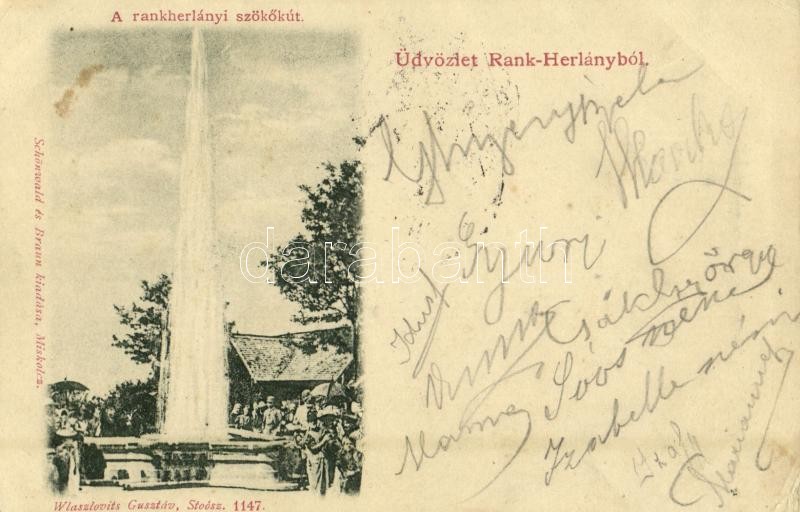 Leírás: Ránkfüred, Rank-Herlány, Rank Herlein, Herlany (Kassa, Kosice, Kaschau); rankherlányi szökőkút. Wlaszlovits Gusztáv 1147. / spring fountain (EK)