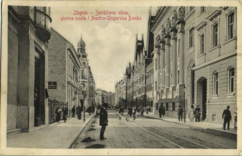 1910 Zagreb, Zágráb, Agram; Jurisiceva ulica, glavna posta i Austro-Ungarska Banka / street view, post office, Austro-Hungarian bank, shop of M. Scukanec, man with wheelbarrow (EK)