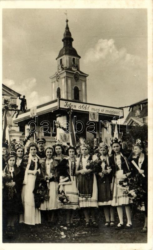 1938 Beregszász, Berehove; bevonulás, honleányok, "Isten áldd meg a magyart" felirat / entry of the Hungarian troops, compatriot women + "1938 Beregszász visszatért" So. Stpl.