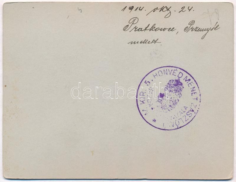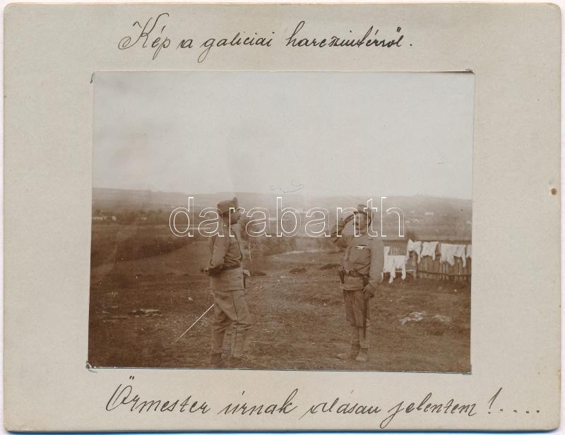 Leírás: 1914 "Őrmester úrnak alásan jelentem!" Osztrák-magyar katonák a galíciai fronton, Pralkowceben (Przemysl mellett), mögöttük száradó ruhák a kerítésen. Fotó keményhátú lapra ragasztva / WWI Austro-Hungarian K.u.K. military, soldiers in Pralkowce (near Przemysl), drying clothes hanged on the fences behind them. photo glued on hard-backed paper + "M. kir. 5. honvéd menetzászlóalj gazdasági hivatala"