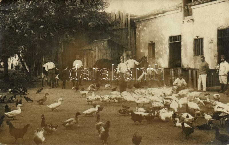 1918 Galati, Galatz; osztrák-magyar katonák a baromfiudvarban etetéskor / WWI K.u.K. (Austro-Hungarian) military, soldiers in the chicken field during feeding. photo