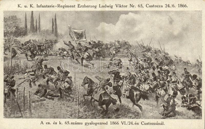 A Cs. és kir. 65. számú gyalogezred 1866 június 24-én Custozzánál / K.u.K. Infanterie-Regiment Erzherzog Ludwig Viktor Nr. 65 at Custozza / Austro-Hungarian military art postcard s: Fritz Neumann (EK)