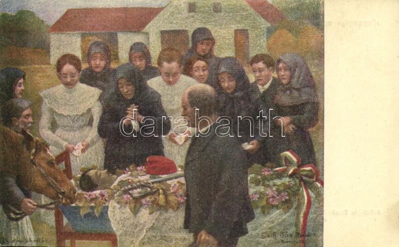 Leírás: A hőst hazahozták. "Derengés" Magyar művészlapjai / Austro-Hungarian (K.u.K.) military art postcard, funeral of a soldier s: Schiff-Jós Benő