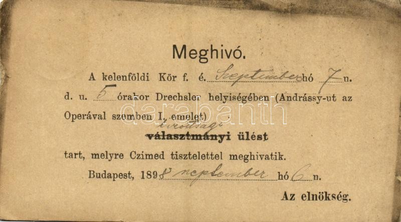 Leírás: 1898 Budapest VI. A Kelenföldi Kör meghívója bizottsági ülésre a Drechsler-palotába (kis szakadás / small tear)