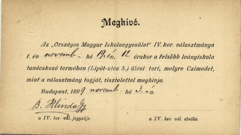 Leírás: 1899 Budapest V. Az "Országos Magyar Iskolaegyesület" IV. kerületi választmánya meghívója