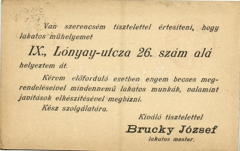 1901 Budapest IX. Brucky József lakatos műhelyének reklámlapja. Lónyay... https://www.darabanth.com/hu/358-Gyorsarveres/358.0/Kepeslapok/Magyarorszag~1000004/1901-Budapest-IX-Brucky-Jozsef-lakatos-muhelyenek-reklamlapja-Lonyay-utca-26~II2061037