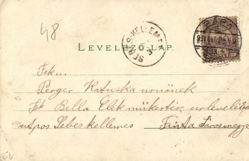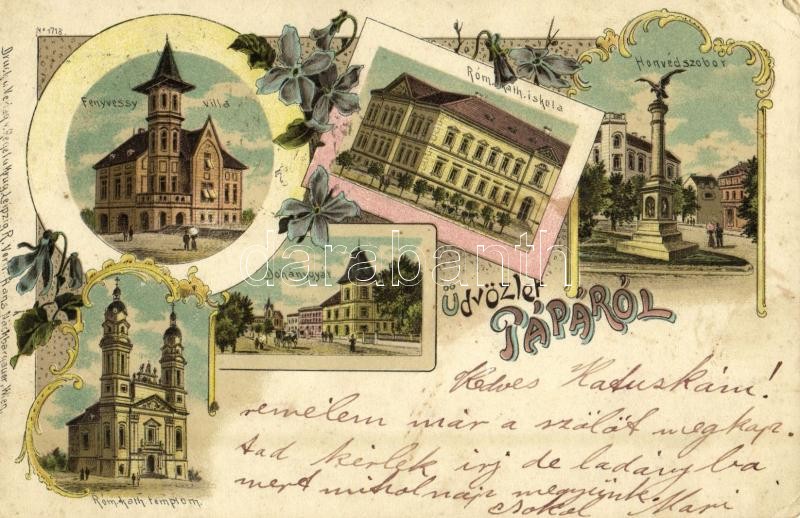 1901 Pápa, Fenyvessy villa, Római katolikus templom és iskola, Dohánygyár, Honvéd szobor. Druck u. Verlag Regel u. Krug No. 1718. Art Nouveau, floral, litho (EK)