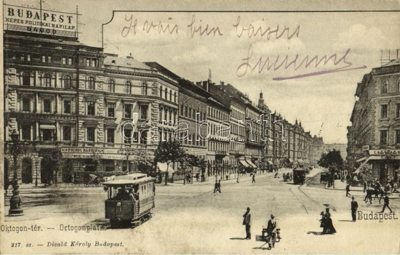Leírás: 1902 Budapest VIII. Oktogon tér, villamosok, "Budapest" Képes Politikai Napilap, Prindl Nándor üzlete. Divald Károly 217. (r)