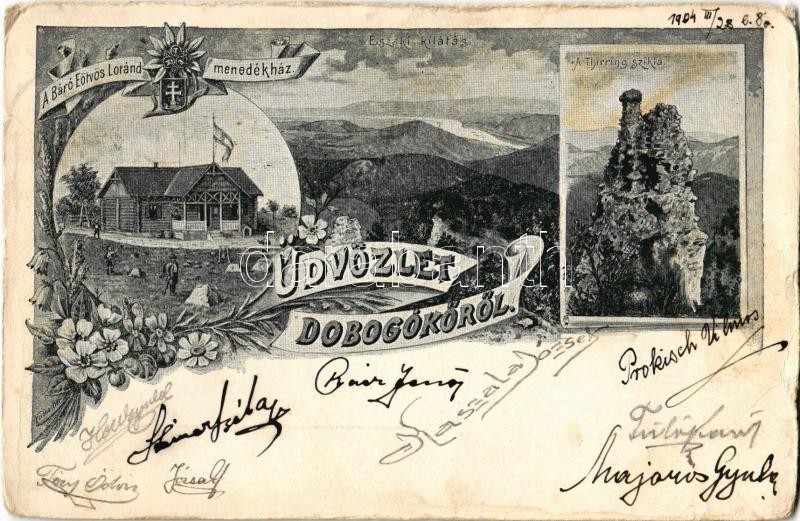 Leírás: 1904 Dobogókő (Pilisszentkereszt), Thirring szikla, Báró Eötvös Loránd menedékház, északi kilátás, kirándulók. Art Nouveau, floral s: Feldbacher (kopott sarkak / worn corners)