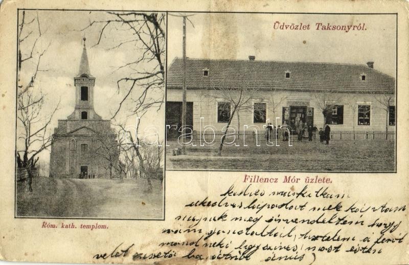1905 Taksony, Római katolikus templom, Fillencz Mór üzlete és saját ki... https://www.darabanth.com/hu/358-Gyorsarveres/358.0/Kepeslapok/Magyarorszag~1000004/1905-Taksony-Romai-katolikus-templom-Fillencz-Mor-uzlete-es-sajat-kiadasa-fa~II2058666