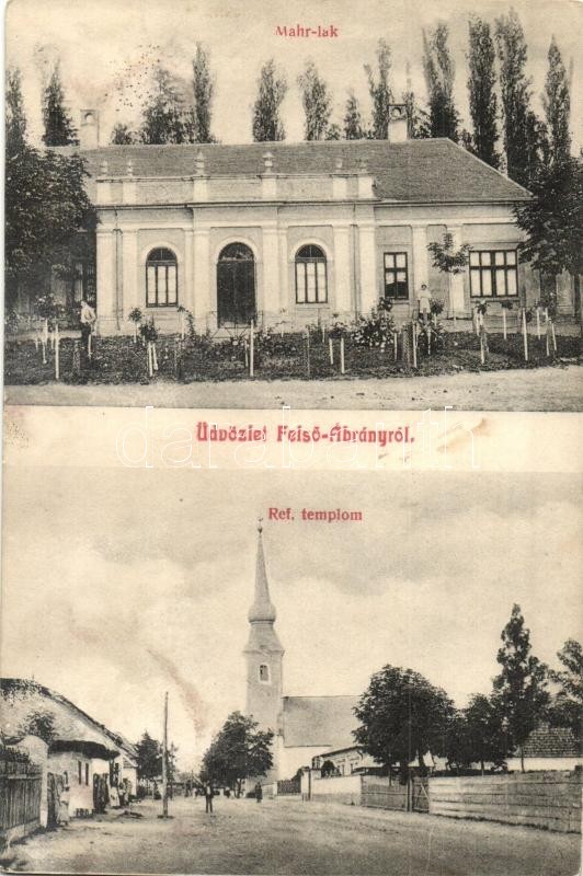 Leírás: 1910 Felsőábrány (Bükkábrány), Mahr-lak, református templom (ázott sarok / wet corner)