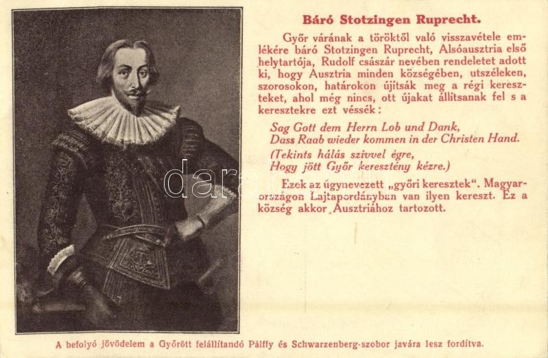 1913 Győr, Báró Stotzingen Ruprecht. Győr várának a törököktől való visszavétele emlékére. A befolyó jövedelem a Győrött felállítandó Pálffy és Schwarzenberg szobor javára lesz fordítva