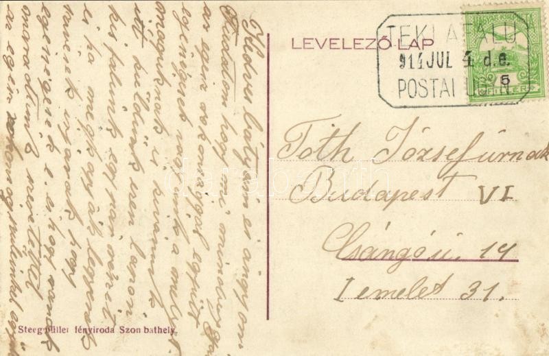 Leírás: 1914 Magyarújfalu (Kétújfalu), utca, lelkészlak, református iskola és templom, magánlak + "Teklafalu Postai Ügyn."