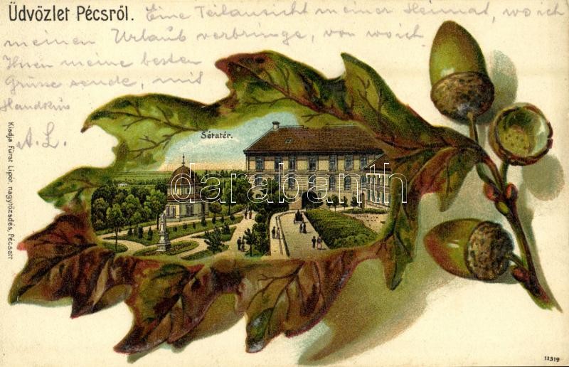 Leírás: 1918 Pécs, Sétatér. Fürst Lipót kiadása. Makkos montázs, Art Nouveau, Emb. litho