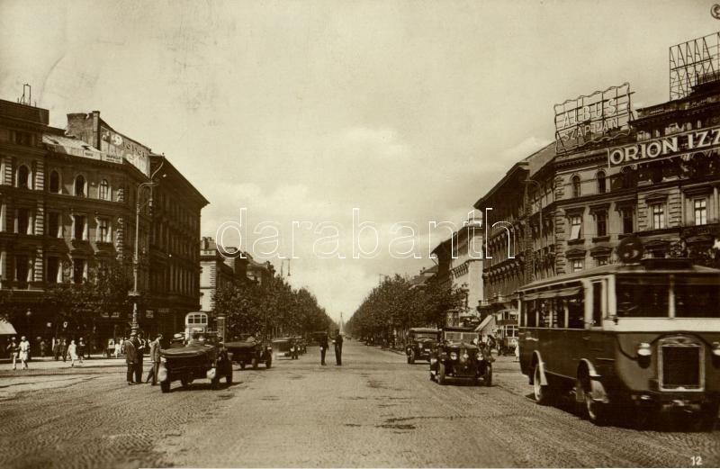 Leírás: 1935 Budapest VI. Oktogon tér, Orion Izzó, Dreher Baksör és Albus szappan reklámja, autóbusz és automobilok